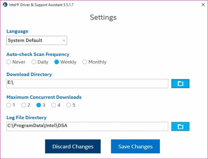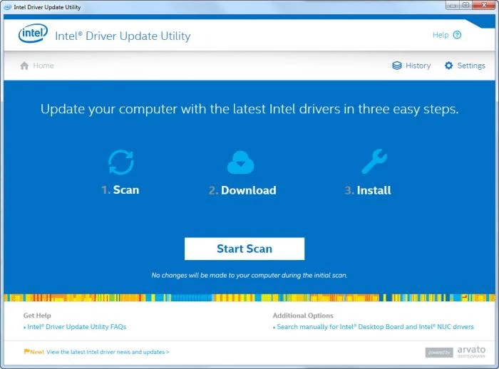 A janela principal é muito atraente e fácil de entender o funcionamento do programa. Primeiro, você precisa clicar no botão "Scan" para obter informações sobre os drivers da placa de vídeo Intel, rede sem fio, placa-mãe, Intel NUCs e Intel Compute Sticks. Após a verificação, a ferramenta oferece uma lista de drivers com informações detalhadas que permitem decidir quais versões são adequadas para o seu sistema. Você pode alterar a frequência da verificação na ferramenta "Executar uma vez" e obter as atualizações mais rápidas sobre os drivers.